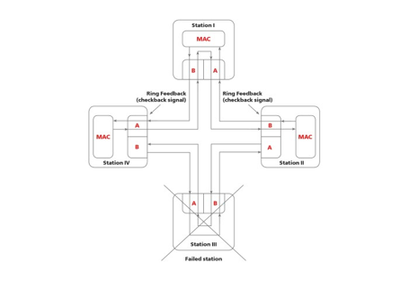 Надлишкове кільце дає змогу обійти несправну станцію. У цьому прикладі немає комутаторів між станціями і мережами, щоб обійти виключену станцію. Резервне кільце використовується замість цього, щоб виконати це завдання. Хоча без комутаторів, відмовостійкість зменшується до одного, а мережа не може обійти іншу точку збою