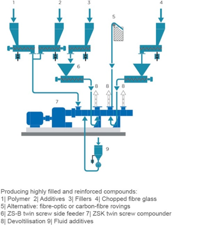 Типова структура компаундера з виробництва сумішей з великим числом наповнювачів. Ці технічні пластмаси широко використовуються в повсякденних продуктах, таких як зубні щітки, пластикові фітинги для автомобільної промисловості, дюбелі та ізоляція кабелів.